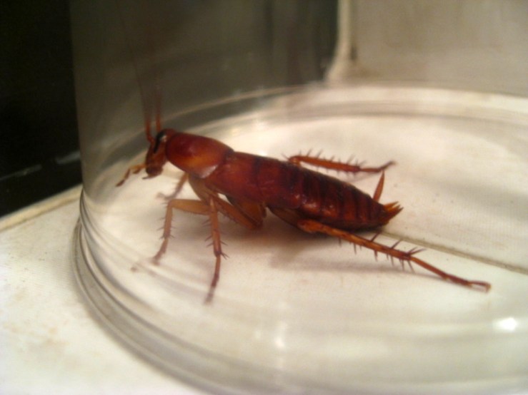 A cockroach I found in the hotel bathroom, trapped beneath a plastic cup.